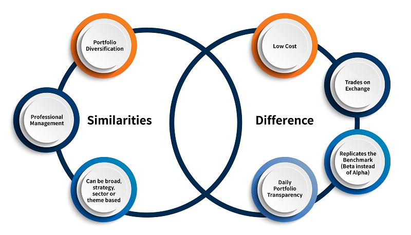Exchange Traded Funds (ETFs) are a professionally managed investment instrument like Mutual Funds. Both provide access to securities and asset classes depending on the desired risk return objective of the fund.